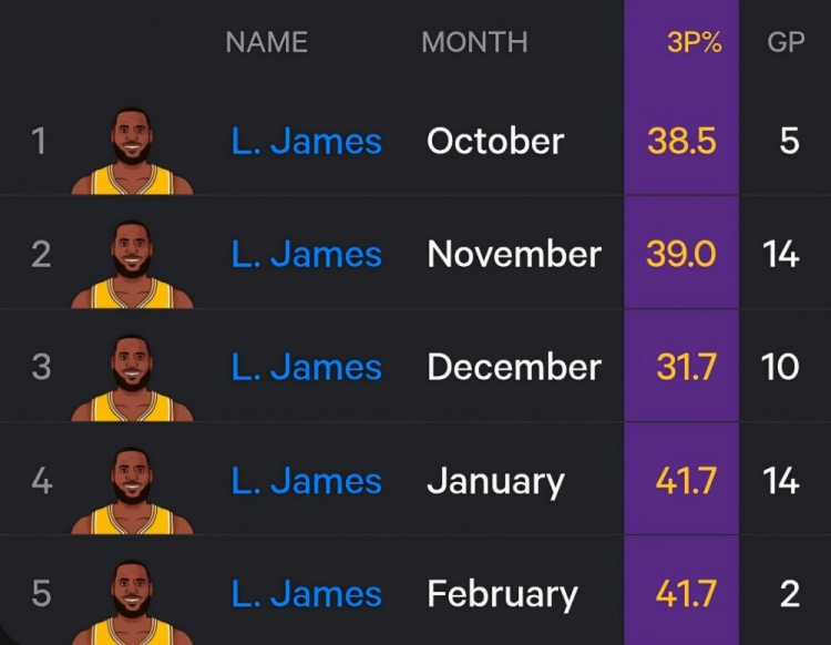 漸入佳境!詹姆斯本賽季每月三分命中率一覽 1月至今高達(dá)41.7%