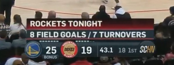 首節(jié)結(jié)束,火箭19-28勇士。他們投籃23中8,出現(xiàn)7次失誤。