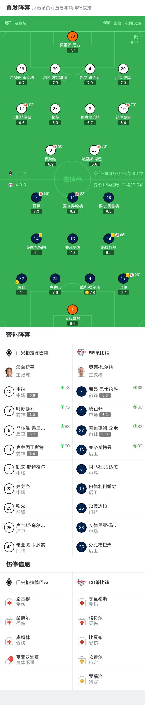 門興0-0萊比錫,奧諾拉破門被吹,勞姆中框,門興全場(chǎng)0射正
