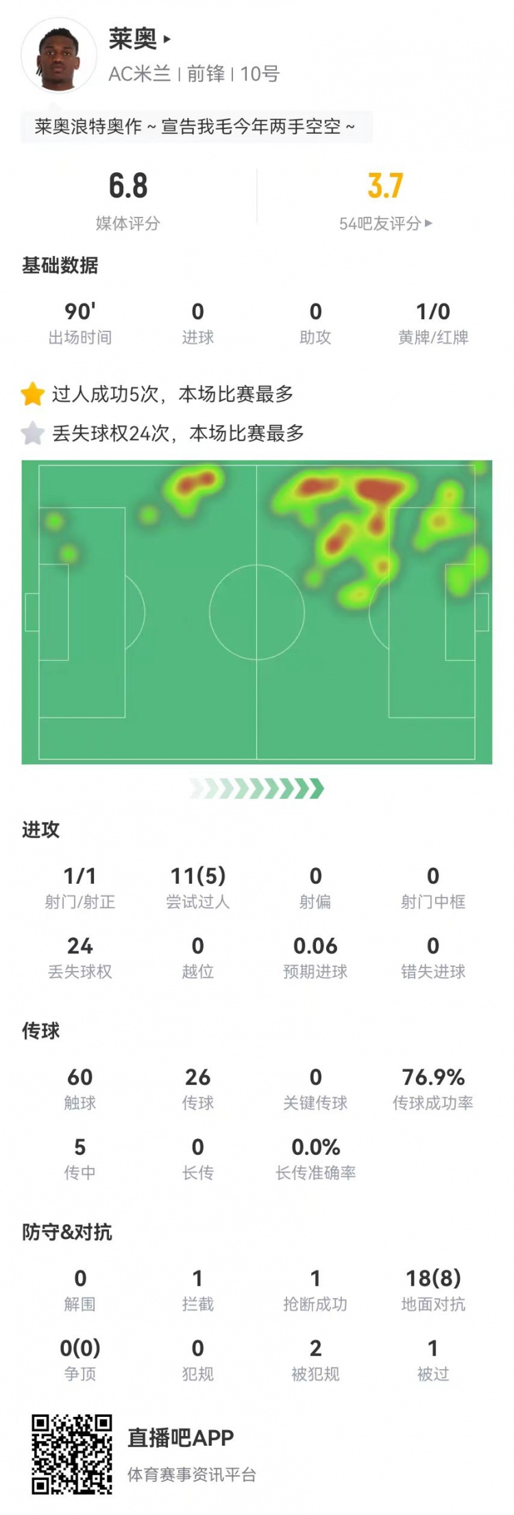 2月19日訊 米蘭在本輪歐冠主場(chǎng)被費(fèi)耶諾德逼平,萊奧本場(chǎng)數(shù)據(jù)如下: