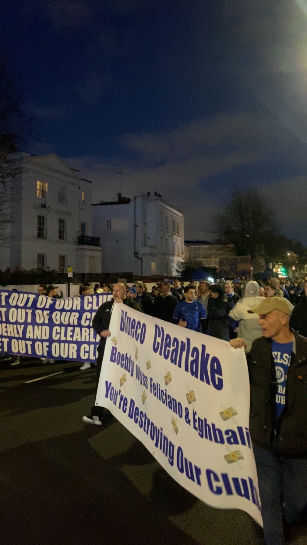 2月26日訊 切爾西VS南安普頓賽前,切爾西球迷聚集在球場(chǎng)外高舉橫幅抗議藍(lán)軍高層。